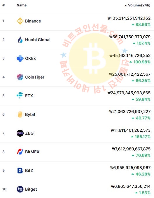 선물 거래소 순위에서는 역시 바이낸스가 압도적인 1위를 기록한 가운데 135조 2142억원의 거래금액을 나타냈다.