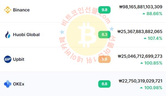 현물거래소 순위에서 거래량으로 정렬시 한국 거래소인 업비트가 처음으로 3위를 차지했는데 이후에 2등까지도 올라갔다가 다시 5위 수준으로 하락했다. 이날 바이낸스 거래소의 현물 거래금액은 98조 1658억원이었다.