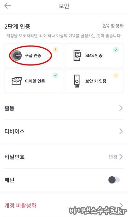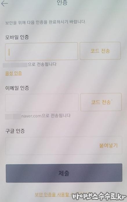 예를들어 제 계정에서 출금을 하기 위해서는 휴대폰문자, 이메일, 구글OTP등을 인증해야 합니다.